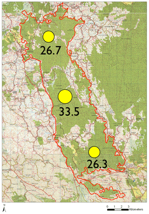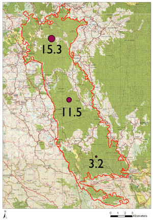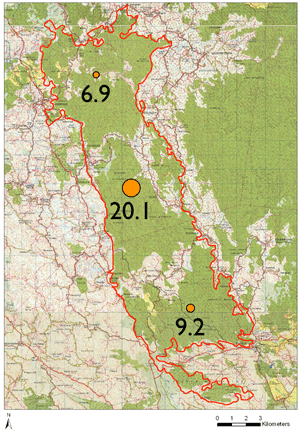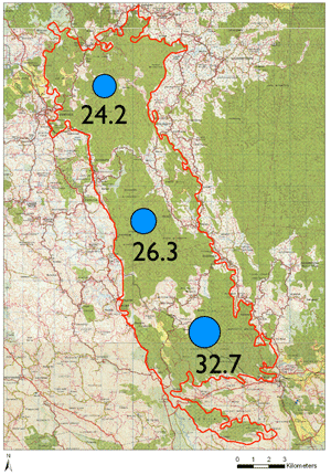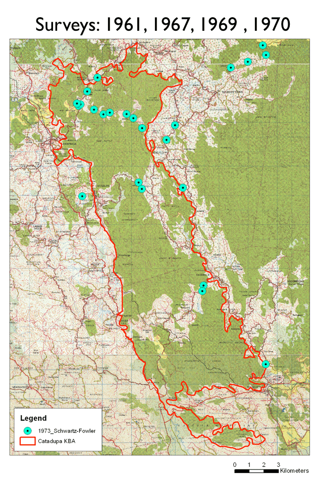 Most common in the central, high rainfall region of the KBA; noticeably not detected in the south |