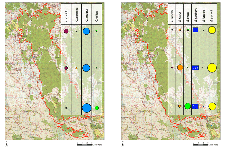 NOTE: The detection distance of each species is highly variable, ranging from > 100 m for Osteopilus crucialis to mere meters for Eleutherodactylus luteolus. This map should NOT be viewed as the relative abundance amongst species, but rather to compare the geographic patterns of EACH species and to highlight the numbers of species along the North-Central-South gradient. *Circles represent CVI scores from acoustic recordings; rectangle is for species which was not detected acoustically, but was handled for chytrid testing. |
