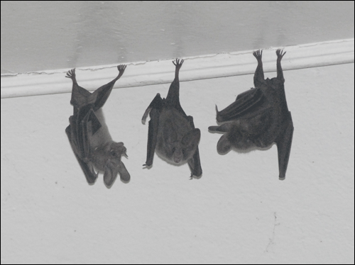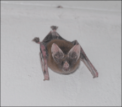 When I moved to Jamaica in 1999, Mr. Mike gave me his old, small office space so he could claim the entire living room for his working area. I was delighted: I quickly discovered that there was a solitary bat living in the ceiling over the office! About 15 minutes before sunset, he would emerge from the closet through an opening in the ceiling, circle my office a few times, and then head outside through an open window. About an hour before sunrise, he would fly through an open window in our bedroom, circle a few times around the room, and then fly back into my office and up into the ceiling, where he would rest throughout the day. I was able to take a photograph of him, which allowed me to confirm his species identity and, at the same time, learn that “he” was, indeed, a “he".