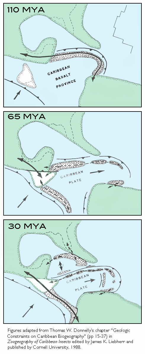 With the movements of the Earth’s crust, the Caribbean Plate s l o w l y muscled its way eastward between North and South America and into the Atlantic Ocean.