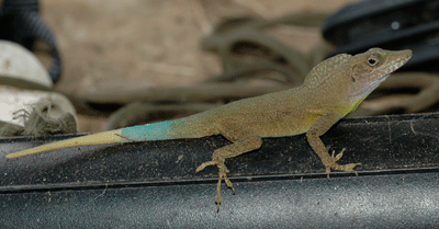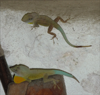 I've never seen a male lose his tail during a fight, so it's actually a rather stylized "battle", no one really gets hurt. Even if a tail-tip did get broken, no problem mon, lizard tails are designed to fall-off when a predator gets a-hold of the tail -- better to lose your tail (and regrow a new one) than lose your life! If you look carefully at the picture of the two males assessing each other's size, you can see the regenerating tail-tip of the male with the extended dewlap.