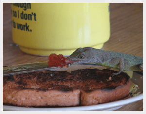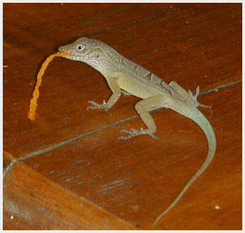 Lunch also is good for anoles on the porch: chocolate chip cookie crumbs, Stilton cheese, sweet gherkin pickles, honey-mustard salad dressing . . . Anolis grahami are like little garbage disposals, cleaning-up my crumby mess in a natural way.