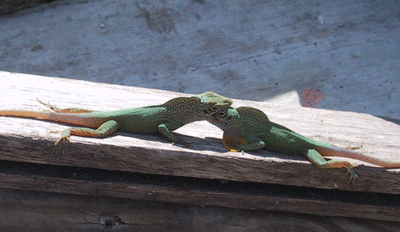 Of course, with two big guys fighting it out, the smallest guy on the porch has a chance to sneak a quickie with an unguarded female! And, if equal-sized males keep fighting each other (the most intense fight I’ve seen lasted almost 45 minutes), then a smaller guy might even get a chance for a second copulation with another female…because male anoles, like many reptiles, have two penises (called hemipenes) and can switch between right and left when needed. I said lizards were sexy ☺ And, this just goes to show you, you don’t always have to be the big, muscle-bound dude on the beach to impress the ladies.