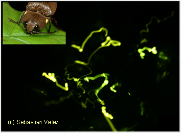 So, the blinky called Photinus euphotus, with its yellowish single-pulse flash, will be active for a brief 15 to 20 minutes just at dusk; Photinus flavolimbatus, with a yellowish three-pulse flash, will peak between 8 - 10 pm, and Photinus synchronous, with a greenish single-pulse flash, runs from midnight to the pre-dawn hours. If you want to predict the time of night when a firefly species will be blinky-active, look at the colour of its light: those which display at dusk tend to have lights with a yellowish tinge while those that sparkle in the middle of the night, when it's completely dark, will have green lights.