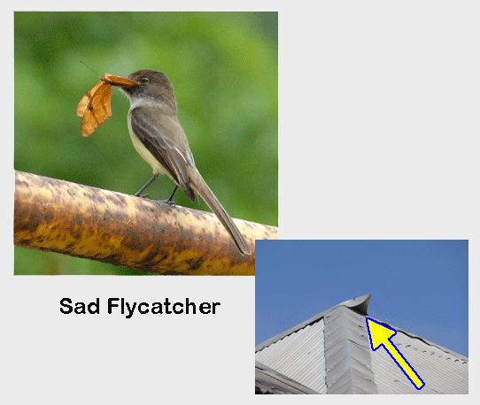 2. Sad Flycatcher (Myiarchus barbirostris; aka Little Tom Fool; endemic): when supplemented with a wooden platform, the scaffolding was used for 4 consecutive years as critical nesting habitat. Alas, the wooden platform / nest box was removed last year when we re-limed the house, so the Sad Flycatchers had to shift their nest to a ridge-cap of the roof, the extended bit resembling a 'duppy perch'. But they still use the scaffolding as a favourite hunting perch, esp. to steal insects trapped in . . .