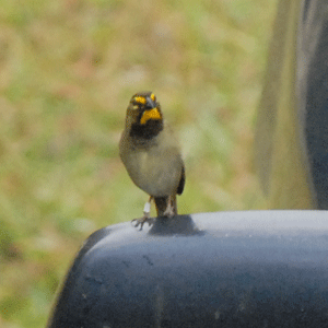 8. Yellow-faced Grassquit (Tiaris olivacea), Black-faced Grassquit (Tiaris bicolor), and Bananaquit (Coereba flaveola): all native, all like to perch on the scaffolding (and the car parked beside it) and give mating-attracting calls during the breeding season. Fledglings also like to perch on the scaffolding and beg merciless for food from their parents.