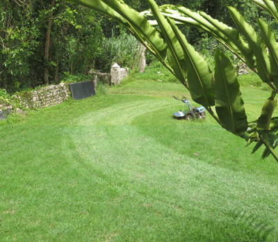 So, with the “rabbit comes out of the hole, around the tree, and back down the hole” proper bowline knot on the tow line, we were off and driving around . . . and around . . and around . . . seen from space, I think we created some impressive circles in the grass.
