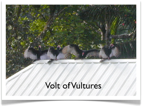 Fortunately for us, our good friend Dr. Gary Graves has as keen affection for vultures as they have for rotting carcasses. Gary and his colleagues were curious about the differences between Turkey Vultures and Black Vultures (Coragyps atratus). As Gary says, Turkey Vultures have an exquisite sense of smell. Indeed, they can detect the scent of decomposing flesh in concentrations as small as a few parts per billion in the air. Investing in such a highly-tuned sensory system can be metabolically expensive, so it’s not unusual for other senses to regress. For example, humans have pretty good daytime visual acuity but our sense of smell is lousy when compared to a dog, which is equally unimpressive at visually detecting somthing at a distance unless it moves. Our new chief of security, GorgonZella (aka Zella, not "stinky cheesehead", tho' her father is a Danish Blue), is 10,000 - 100,000 times better at detecting smells than I am: where I could detect the smell of a cube of sugar in a cup of coffee, she could detect that same amount of sugar in the equivalent of two Olympic-sized swimming pools filled with water. Of course, we all smell the foul, worse-than-dead-rat stench of the rotting coconuts she brings to her bed, ick. Interestingly, Jamaican Turkey Vultures also enjoy picking at old, rotting, split-open coconuts which they find on the ground.
