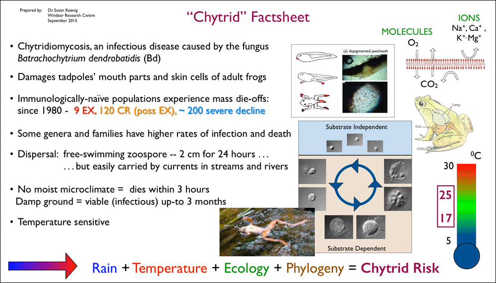 Below are two slides which WRC's Dr. Susan Koenig created for a Keynote presentation, which give a brief overview of "chytrid" and the reason why we think the Jamaican Bromeliad Frog is at great risk of being exposed to and dying from chytrid compared to other species in the family Eleutherodactylidae or for species in Jamaica's other frog family called Hylidae.