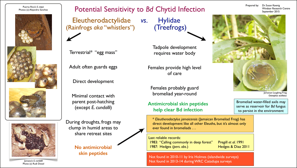 In Jamaica, experts think at least one endemic frog, the Jamaican Stream Frog (Eleutherodactylus orcutti), which was restricted entirely to the Blue Mountains, has gone extinct from chytrid. After conducting surveys in Catadupa, Windsor Research Centre (WRC) also shares the concern of Holmes et al. (2012) for Jamaica's second semi-aquatic Eleuth, the Jamaican Bromeliad Frog (Eleutherodactylus jamaicensis): we, too, failed to confirm its presence during our surveys. Although several individuals of Eleutherodactylus were collected from bromeliad leaves, photographs revealed that they were NOT E. jamaicensis. Two factors raise the "red flag of concern" for this species: (1) frogs in the family Eleutherodactylidae show a higher sensitivity to chytrid fungus than many other anuran families; and (b) the Jamaican Bromeliad Frog's special ecology.