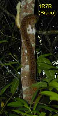 Photo on left: the Boa clearly has no problem climbing even this smooth-trunked tree. She'll "hitch" her way up the tree.