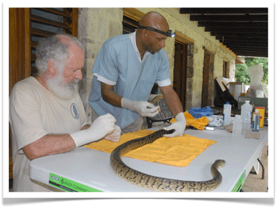 Fortunately, in 2008, Dr. Craig Rudolph was on-holiday in Jamaica, enjoying our endemic birds in Cockpit Country, and enjoying a "Sugarbelly Dinner" . . . and the next thing we knew, we were able to properly study the movements and activity patterns of Jamaican Boas thanks to funding support and / or the loan of equipment from USDA-Forest Service, USFWS Wildlife Without Borders, Jacksonville Zoo and Gardens, and Windsor Research Centre. The photo shows Craig (on the left) giving guidance to Dr. Michael Whittingham DVM as he prepares to surgically implant a radio transmitter. We are enormously grateful to "Dr. Mike" for looking after all of the boas.