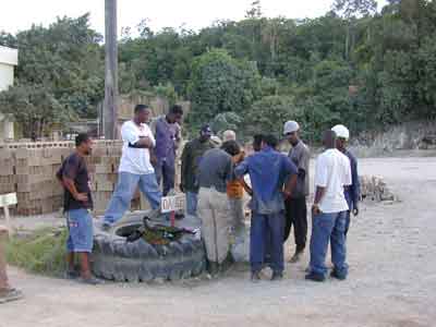 But remember the third paragraph above: rats are the major component of the boas' diet so we need not worry about the birds -- Nature is in balance in the interior of Cockpit Country and we respect all components of the web of life. Local farmers, however, were not so keen and immediately offered to continue killing all boas. Indeed, Susan and her crew periodically encountered chopped boa carcasses in the forest. We realized people were killing snakes for a number of reasons, including a mis-informed fear that boas were venomous, the Bible told them snakes were evil, and they had no knowledge that boas could be beneficial to their farm crops. So we began an informal education campaign, where if someone finds a boa they could come and tell us and we will capture the animal. This gives us the opportunity to show people that boas are gentle when they are handled safely and respectfully (NOTE: remember, don't catch them unless you have a permit and have been shown how to properly hold a snake -- you can hurt them, esp. their jaws, if you don't know what you are doing!) We often ask the "obnoxious young man" at the back of the crowd to help us hold the snake -- sexism is great, if Susan can touch a snake, the young man has to defend his manhood! We spend a lot of time talking about the benefits of boas. As Miss Herma says, "She never love de suh-nake like Miss Susan, but she keep her cutlass down now when she see one: him no trouble her."