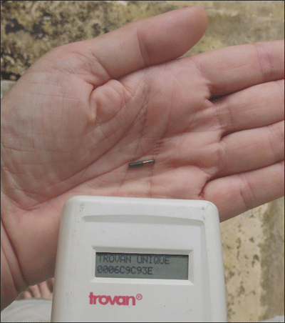The microchips, which are 11.5 mm long -- slightly larger than a grain of rice --, are called Passive Implantable Transponders (PIT). The PIT tags do not actively emit any kind of signal. Rather, we use a separate hand-helder "reader" which wirelessly queries the transponder with radio waves and the coding of the microchip is communicated back to the reader. The range of our reader is less than 10 cm . . . this means, we have to have the boa in-hand in order to identify it by its PIT.