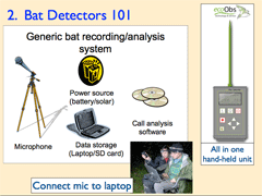 In 2015, WRC's Dr. Susan Koenig held two field workshops and one seminar to demonstrate how to survey and identify bats acoustically using ultrasonic bat detectors. We've uploaded the presentations so others can learn how bat detectors work and so everyone can better-appreciate the strengths and weaknesses of this important tool for surveying bats.