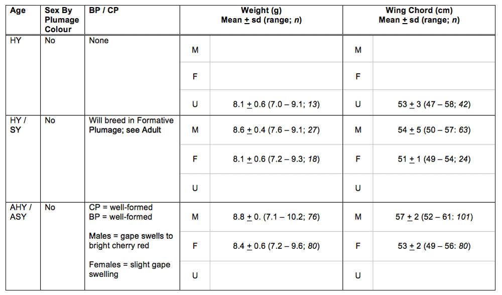 Sexing of adults by wing chord appears possible with WC < 52 = female; WC > 57 = male.
