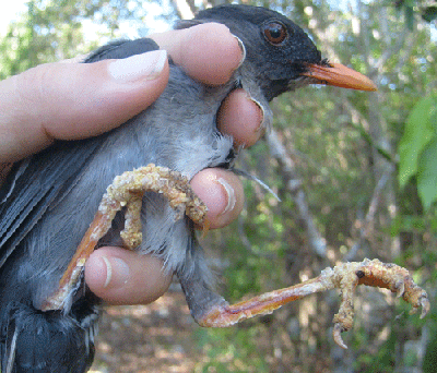 Bananaquit) with “scaly mite” (Knemidocoptes spp.) on their legs (See also Blake 1957).