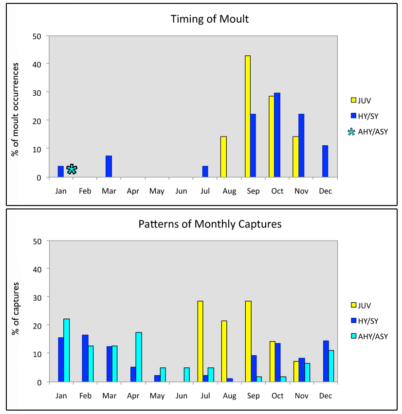When Susan was assembling the data and photographs, we couldn’t believe how incompetent she was - - how was it possible that she didn’t have a single photograph of an adult WCTH?!? Then when she created the “Timing of Moult” chart, she thought “how is it possible that out of 77 adults, I only detected a trace of moult (10% on the head) for only ONE individual?!?” Ah ha! Look at the patterns of monthly captures (Figures below):