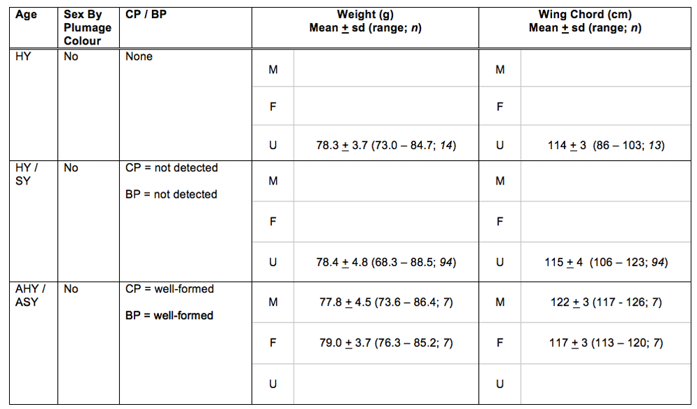 Sexing of adults by wing chord appears possible with WC < 117 = female; WC > 120 = male….but caution is urged until additional morphometric data are available from other populations across the island.