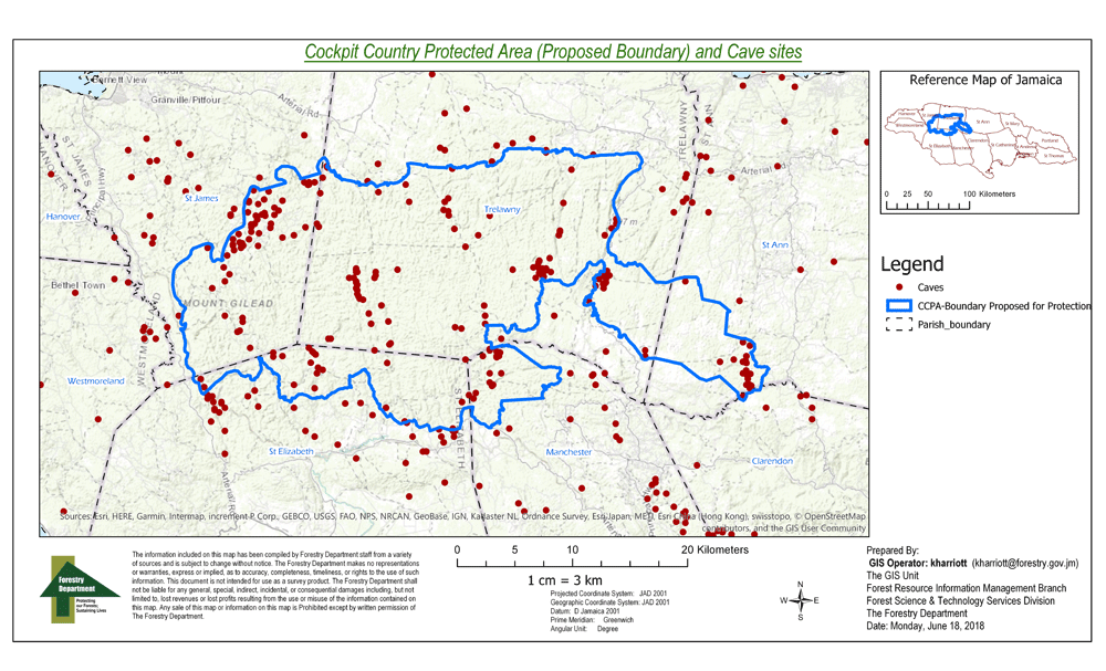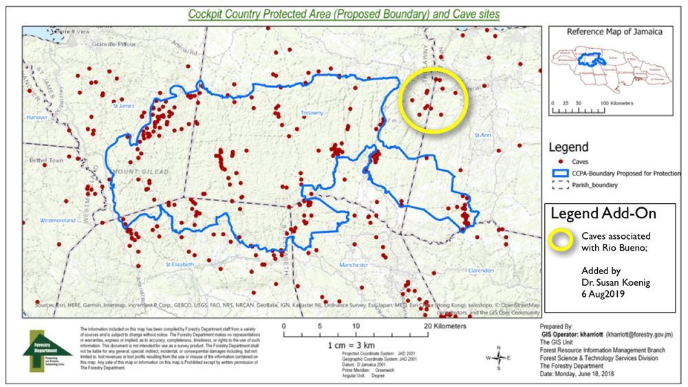 As shown by the higher-resolution map created by Forestry Department on June 18, 2018, the (Proposed Boundary) of the Cockpit Country Protected Area (CCPA) not only excludes numerous caves in the lanscape but as highlighted in the below map by the yellow circle, which Dr. Susan Koenig added to Forestry Department's map, the (CCPA) excludes specific caves associated with the Rio Bueno watershed. The Rio Bueno forms the northern border between the parishes of St. Ann and Trelawny.