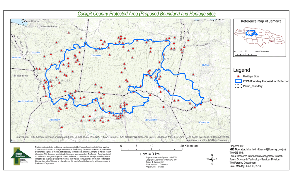 As shown by the higher-resolution map created by Forestry Department on June 18, 2018, the (Proposed Boundary) of the Cockpit Country Protected Area (CCPA) excludes numerous heritage sites identified by the Jamaica National Heritage Trust's 2009 Report: Cockpit Country Heritage Survey.
