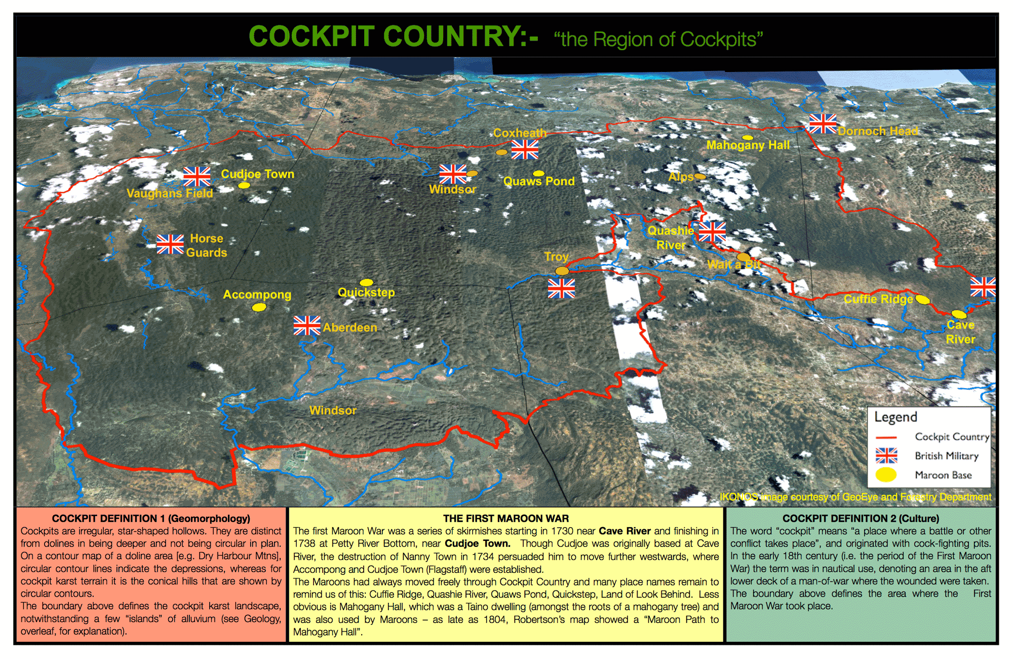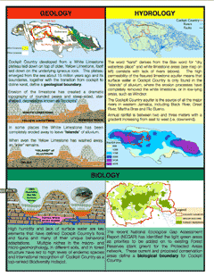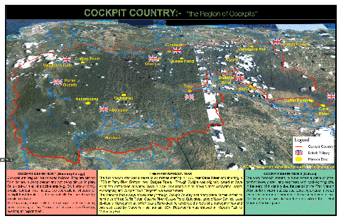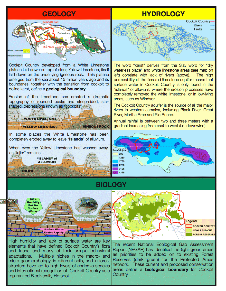 We then drew a boundary which enclosed these overlapping features, generally sticking to existing roads (which, themselves, developed becasue cockpit karst morphology and its hydrology greatly influences HOW humans move through the landforms and WHERE they settle to live and grow food). To the best of our knowledge, this was the first time anyone brought together all abiotic and biotic features, to let Cockpit Country define itself.