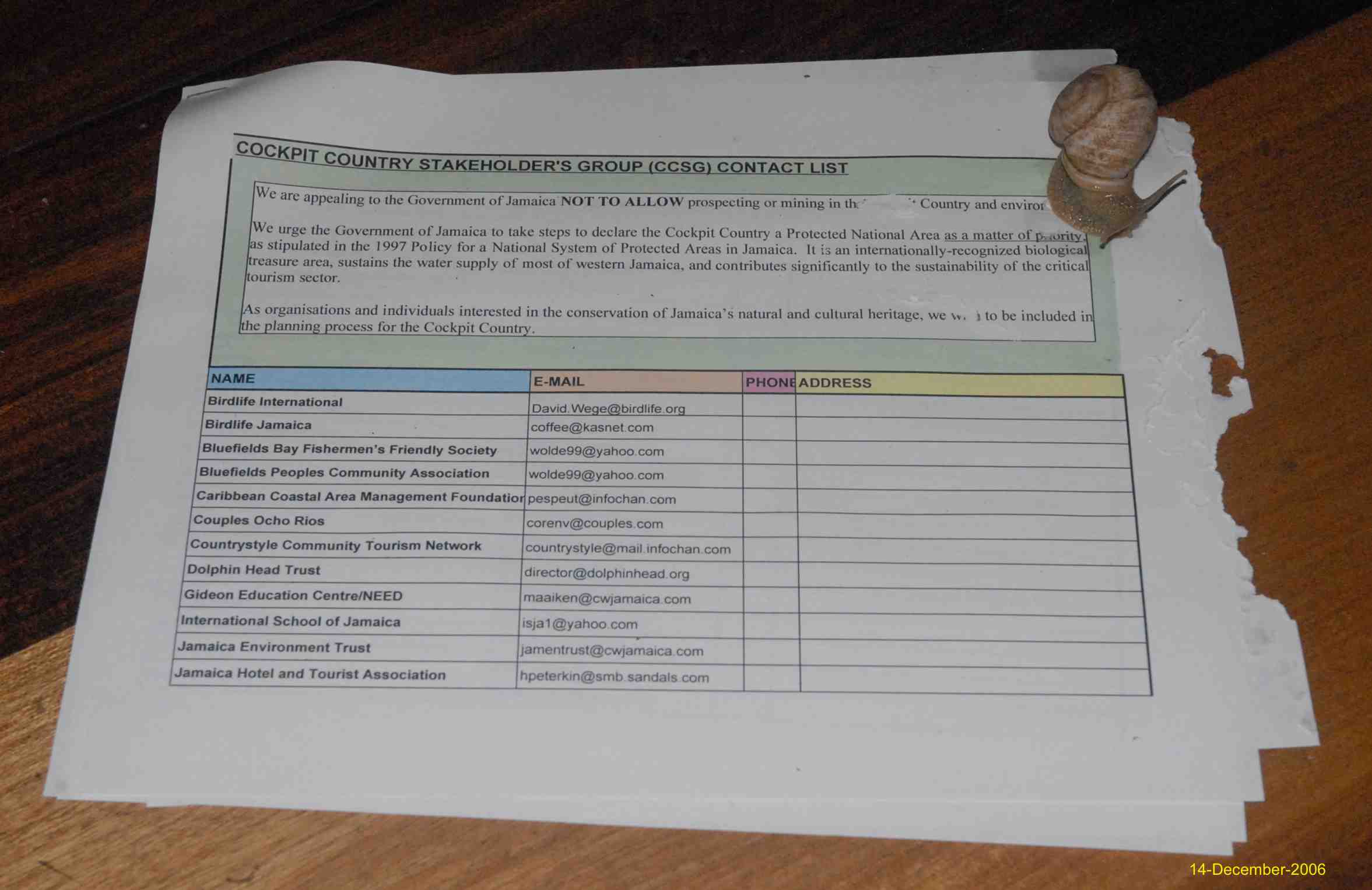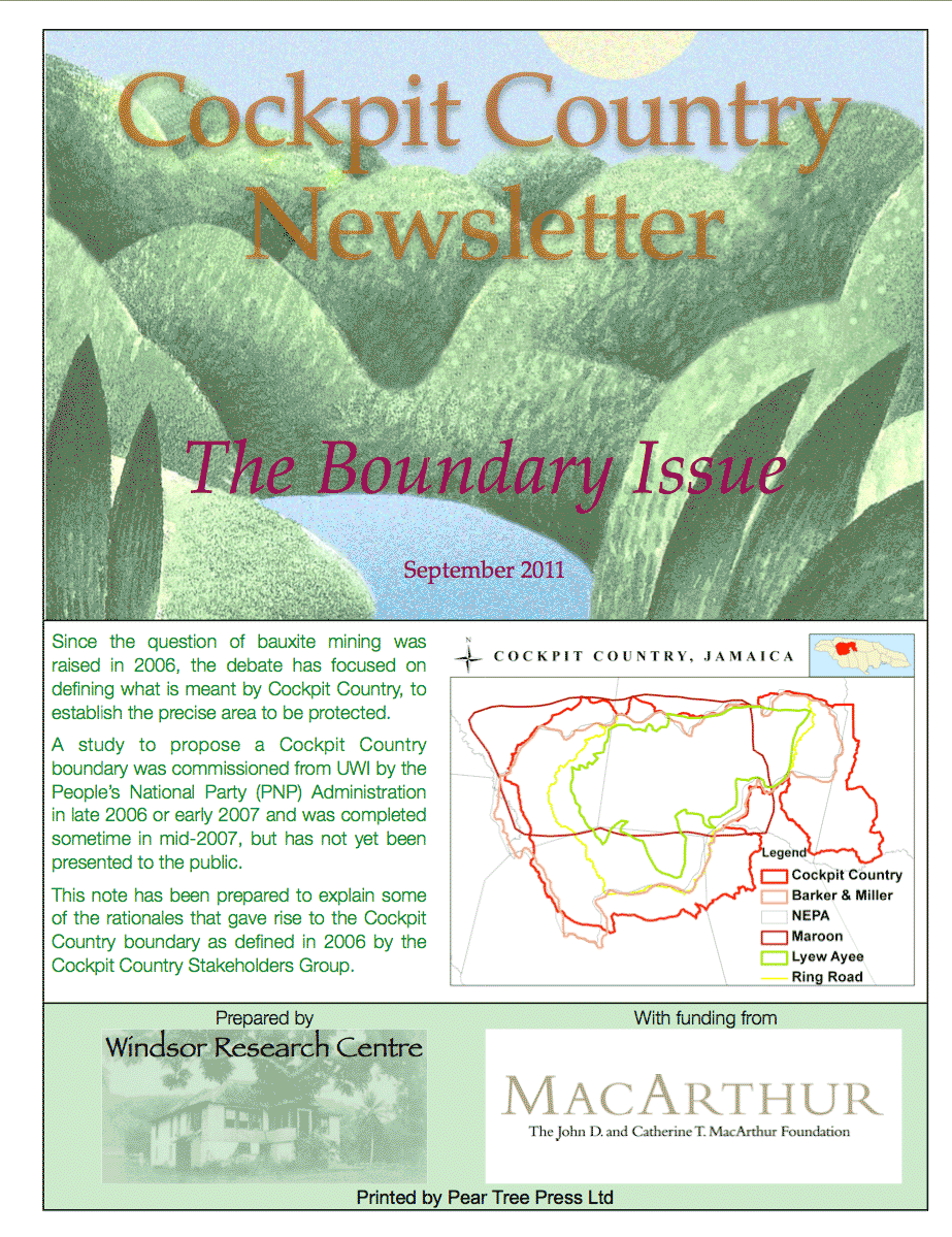 This boundary, encompassing 116,218 hectares, was recognized by the Cockpit Country Stakeholders Group (CCSG) in November 2006 and presented in early Decemeber 2006 to Dr. Omar Davies in his capacity as Minister of Finance and Planning.