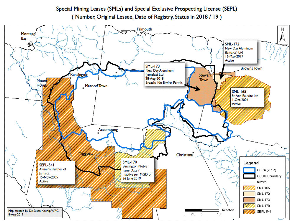 The CCPA (2017) boundary, however, made immediate sense when the Prime Minister revealed "Map 7 - Cockpit Country Protected Area with Existing Mining Licences (sic)" (this map appears on pg 11 of his speech). We have updated "Map 7" to show the status of the Special Mining Leases (SMLs) and Special Exclusive Prospecting License (SEPL), as known to us on 22 August 2019.