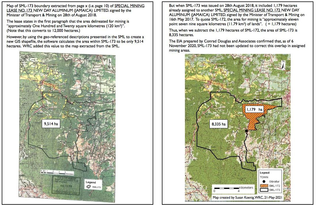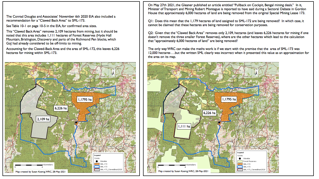 Unfortunately, the Gleaner article didn't include a map of the area to which the Minister was referring. But being as familiar as she is with the maps of the Special Mininig Leases (SMLs) in-and-around Cockpit Country, WRC's Dr. Susan Koenig was unable to do the "mental maths" to reconcile the Minister's statement. Where are these 6,000 hectares coming from?