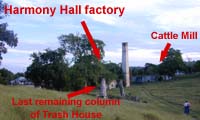 About a mile towards the east of Duncans you come to a crossroad with dirt tracks leading to Lancaster on the right and Harmony Hall (see gateposts) on the left (North). These are privately owned estates and permission is required to visit. Harmony Hall was a sugar estate that converted to coconut production sometime after Emancipation and is now in cattle production. The Great House on top of the hill burned down long ago and has been replaced by a modern house which is visible from Silver Sands. About a mile from the gate is a magnificent sugar factory dominated by a cut-stone chimney. Note the cattle mill to the southwest of the main factory and the two remaining tapered columns of the drying house for trash (which would then be used for the furnace). Lancaster was the bigger of the two estates with about 1300 acres as opposed to 800 acres for HH. Lancaster had its own factory, windmill and wharf down at the boundary with Braco.