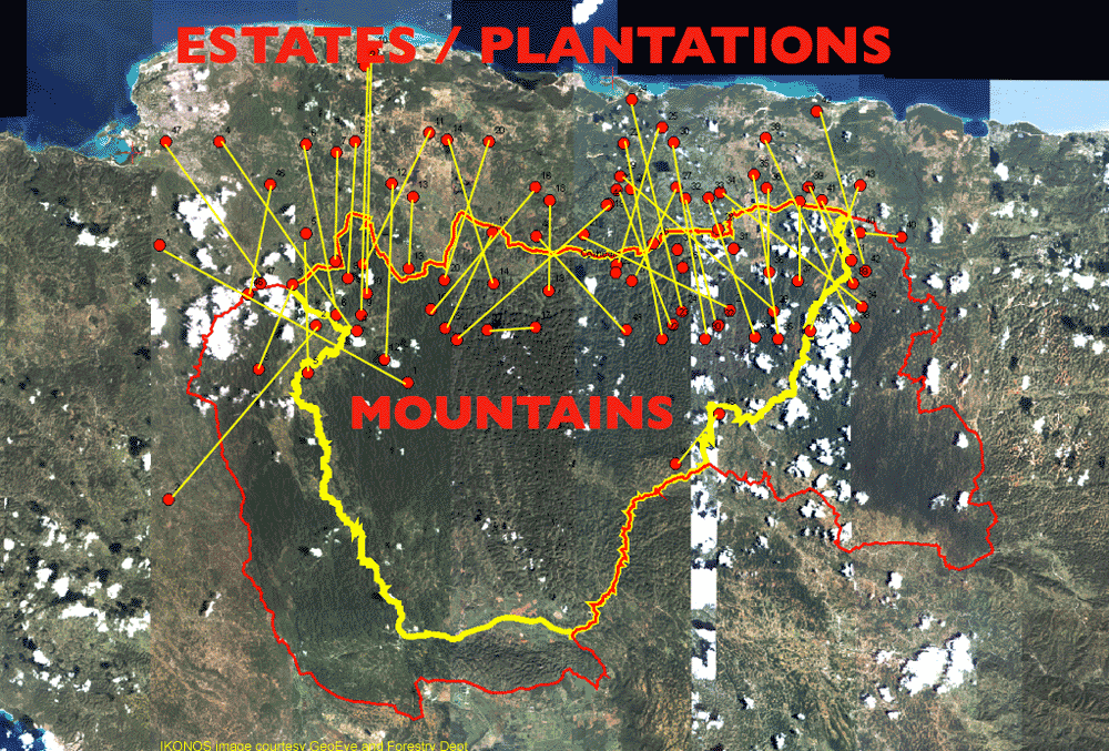 The drawing is adapted from Higman, 1988, Jamaica Surveyed and shows how various mountains in Cockpit Country were related to different estates.
