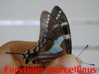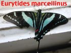 Blue Swallowtail or Jamaican Kite Swallowtail (Protographium (Eurytides) marcellinus) at Windsor. This is one of our endemic butterflies and it is protected under the Wild Life Protection Act (1945). You could be fined up-to J$100,000 or spend one year in jail if you have one butterfly in your possession without a permit. Multiple animals = multiple offenses: each one counts. Until our sighting, St Thomas was reported to be the only known parish where it bred (Jamaica Naturalist Vol 4 Dec 1994). We have now observed this butterfly annually at Windsor. A strong direct flier, the Blue Kite Swallowtail always seems to be going somewhere with a mission! We were pleased to obtain our first photos of this animal (rather battered) trapped inside the house. | ![]() |