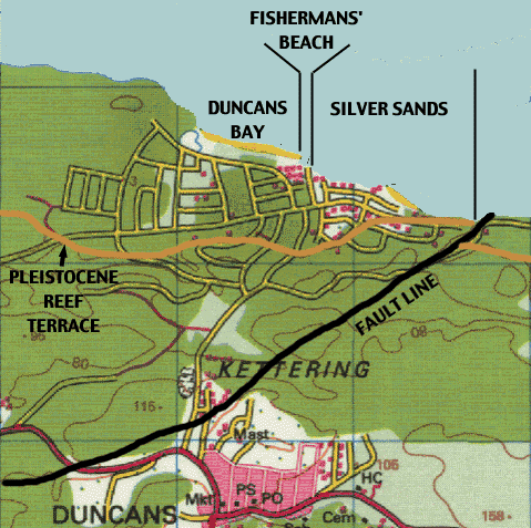 reef terrace; note the discontinuity at the fault line where the
