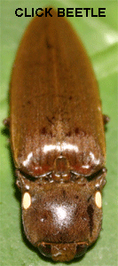 Click beetles are so called because they have a jumping mechanism composed of a prothoracic projection that fits into a socket on the middle part of the thorax, which when activated makes a clicking sound. When placed on its back or held in one's hand, a click beetle will flex its prothorax against the socket and catapult itself several inches into the air attempting to right itself and escape, making its namesake sound.